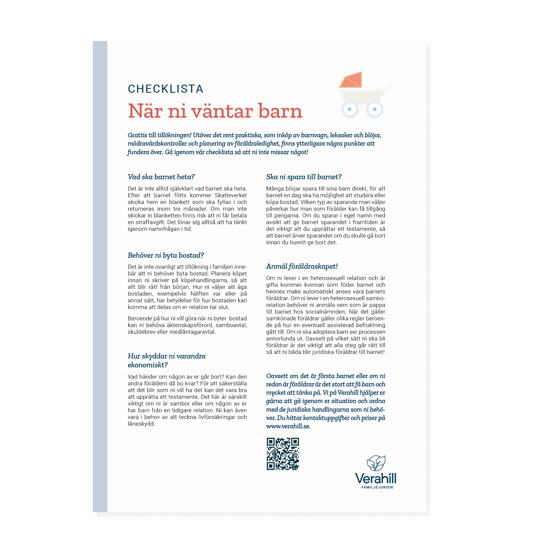 Oavsett om det är första barnet eller om ni redan är föräldrar är det stort att få barn och mycket att tänka på. Vi på Verahill hjälper er gärna att gå igenom er situation och ordna med de juridiska handlingarna som ni behöver.