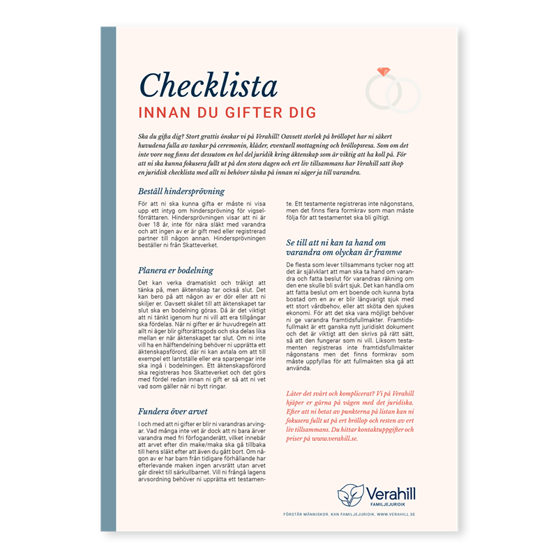 Ska du gifta dig? Stort grattis önskar vi på Verahill! Oavsett storlek på bröllopet har ni säkert huvudena fulla av tankar på ceremonin, kläder, eventuell mottagning och bröllopsresa. Som om det inte vore nog finns det dessutom en hel del juridik kring äktenskap som är viktig att ha koll på. För att ni ska kunna fokusera fullt ut på den stora dagen och ert liv tillsammans har Verahill satt ihop en juridisk checklista med allt ni behöver tänka på innan ni säger ja till varandra.