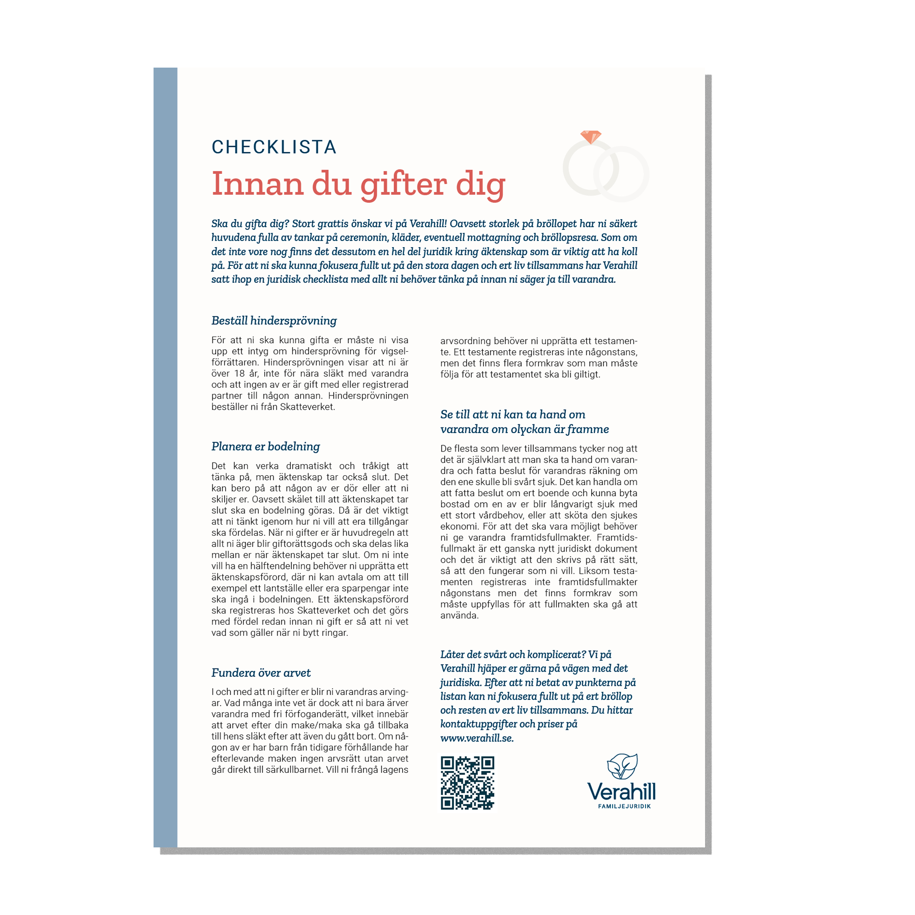 Ska du gifta dig? Stort grattis önskar vi på Verahill! Oavsett storlek på bröllopet har ni säkert huvudena fulla av tankar på ceremonin, kläder, eventuell mottagning och bröllopsresa. Som om det inte vore nog finns det dessutom en hel del juridik kring äktenskap som är viktig att ha koll på. För att ni ska kunna fokusera fullt ut på den stora dagen och ert liv tillsammans har Verahill satt ihop en juridisk checklista med allt ni behöver tänka på innan ni säger ja till varandra.